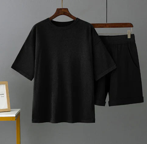 Men's set including an oversized top and bottom with an elastic band, suitable for daily use or leisure. Designed to be worn in casual situations without size restrictions. The design allows for versatile use for different activities.